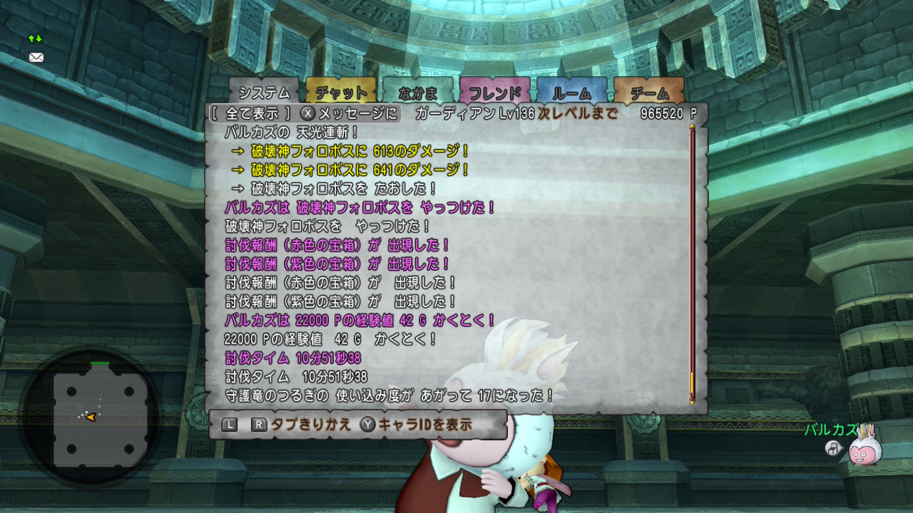 なおガーディアンプクリポは退魔の鏡を張りながら攻撃したりしておりました。フォロボスの弱点は光属性だし、呪文を跳ね返せるしでガーディアンも活躍できるかな。ダメージソースのルゥさんも大活躍だったで。