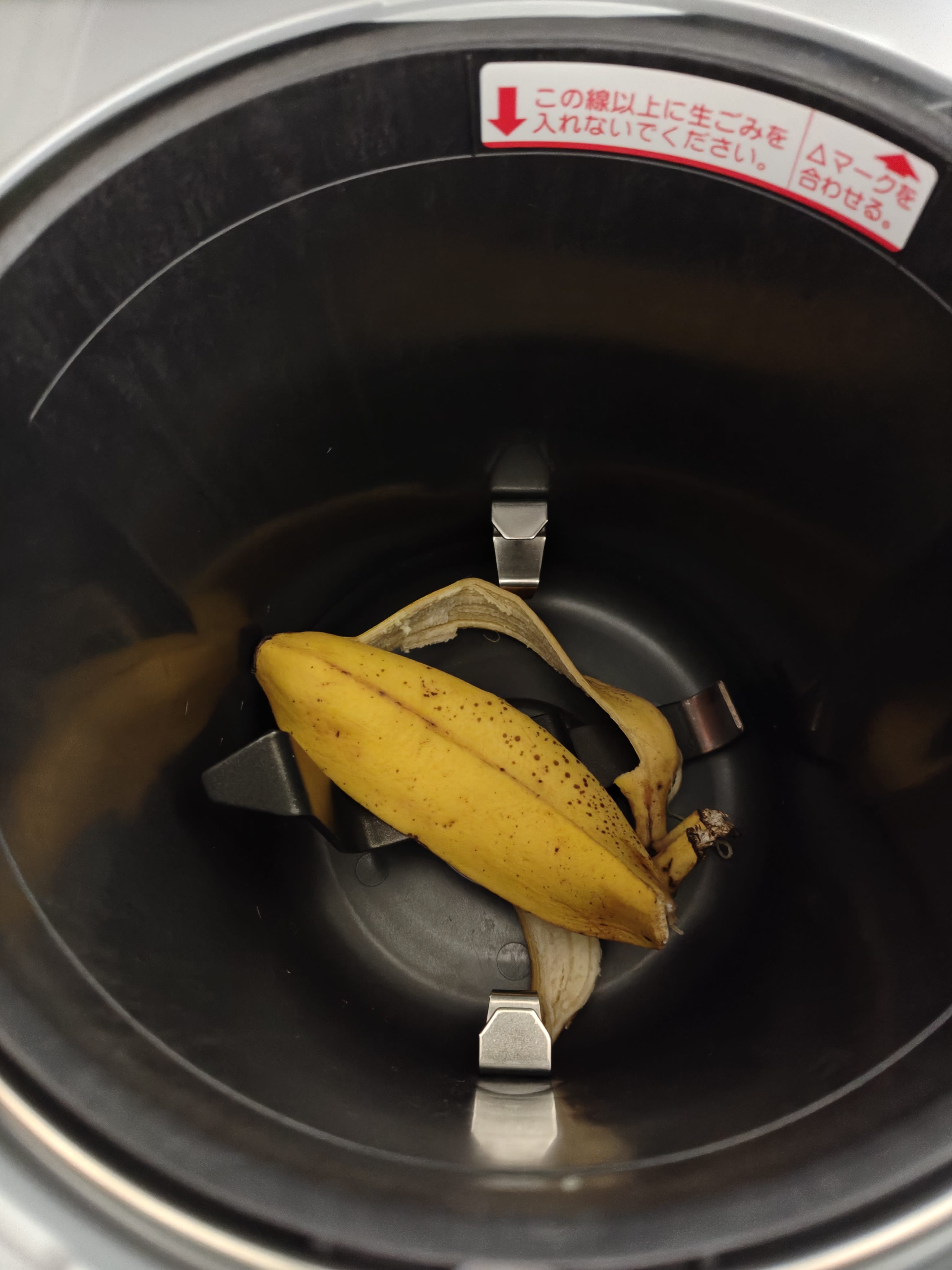 まずはどんな感じになるのか、バナナの皮を1枚だけ投入してスイッチON。意外とかさばるバナナの皮だけど、処理されるとどんな姿になるんだろう。期待に胸を膨らませつつ処理完了まで待つ。