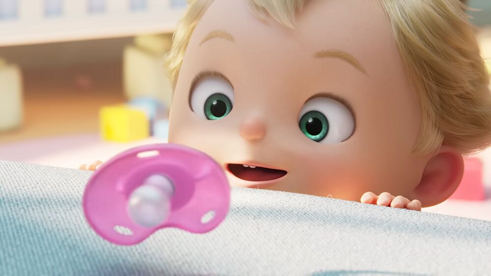 動画では、おしゃぶりを加えた赤子と母親が登場。母親が犬の鳴き声に反応して部屋から出ていったのち、グラグラ揺れるブロックのおもちゃが映し出されます。その後、赤子が加えたおしゃぶりやラトルが勝手に動きだし、おしゃぶりがソファーの上、棚の上へと移動。そして、おしゃぶりがベビーベッドに落下するのをみた赤子が、おもむろに立ち上がろうとしています。